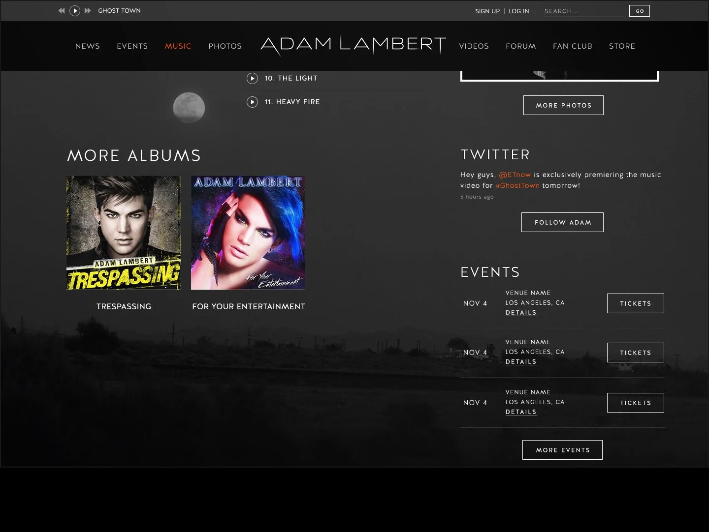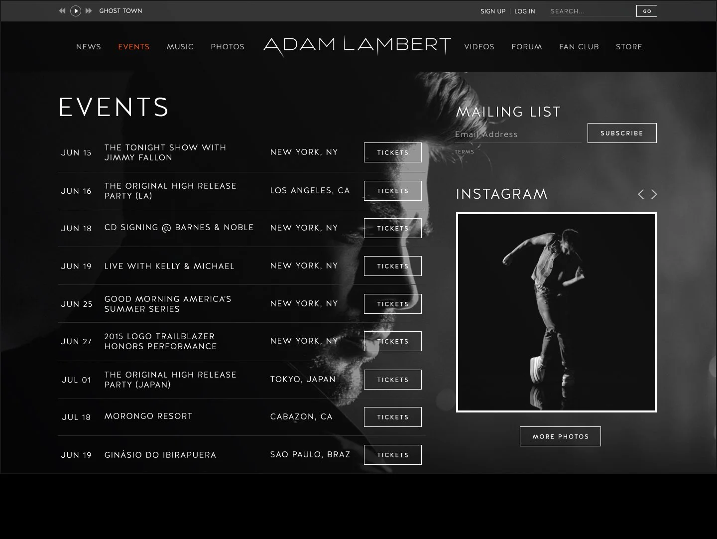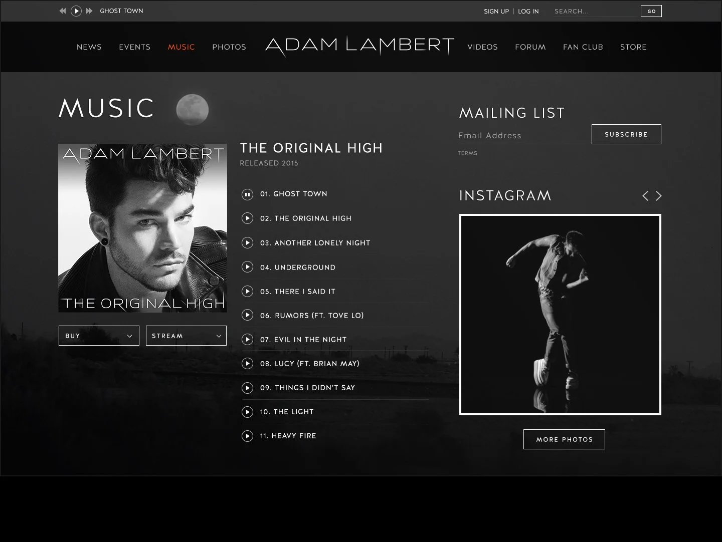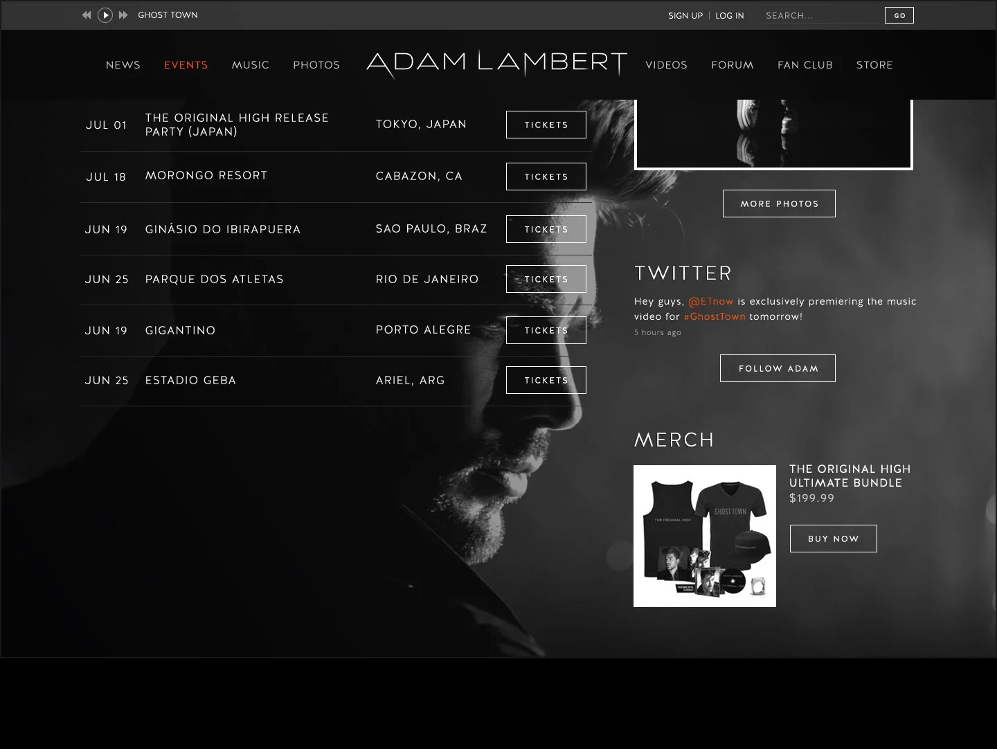 To promote his new album The Original High, Adam Lambert needed a new website. The site needed to allow users to easily purchase the album and singles, access tour tickets, watch music videos, connect with social media accounts, sign up for the mailing list, and explore his music catalog. Working closely with Adam and his marketing team, I designed a website that reflected the album’s aesthetic and sound, delivering a seamless and engaging experience for fans.