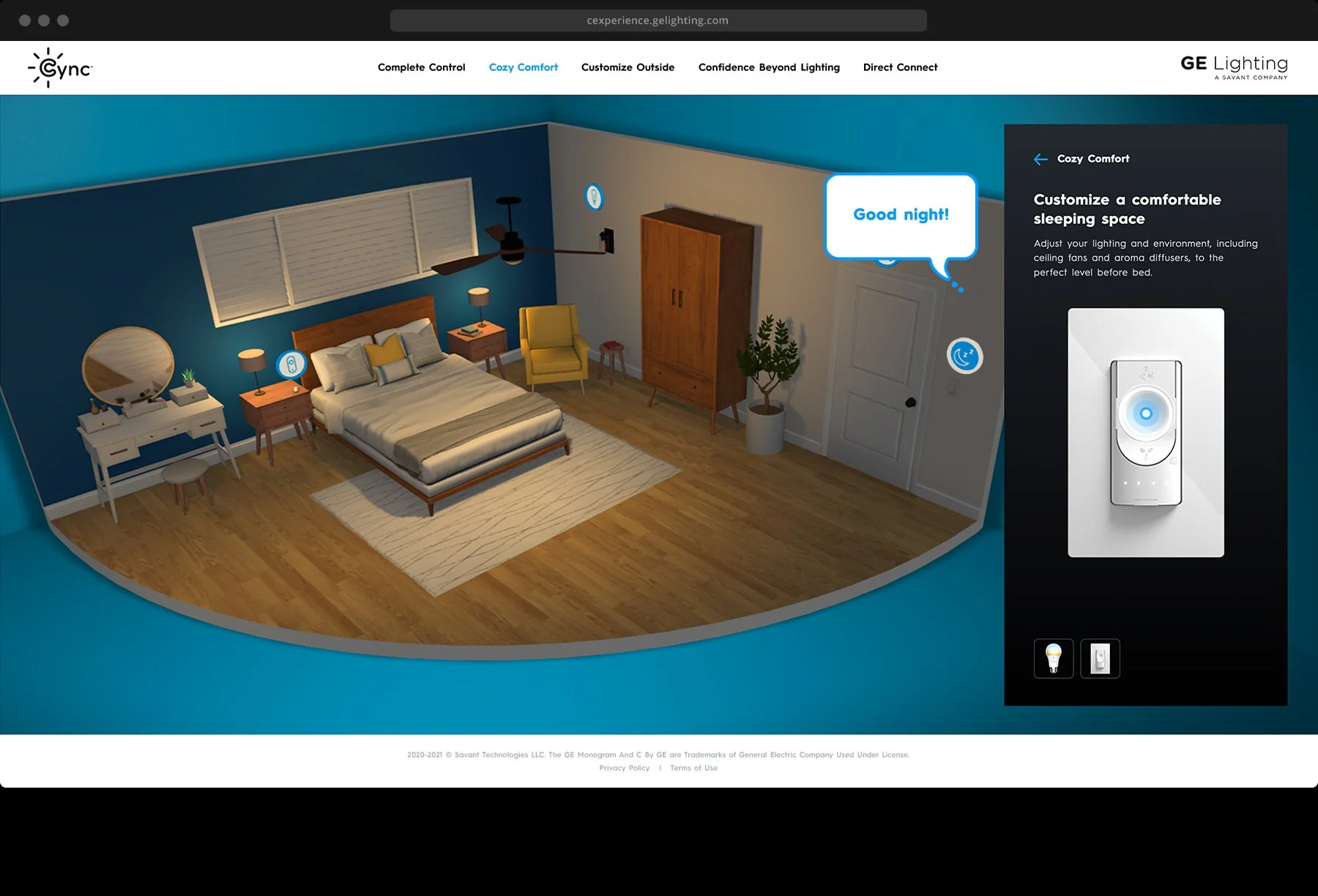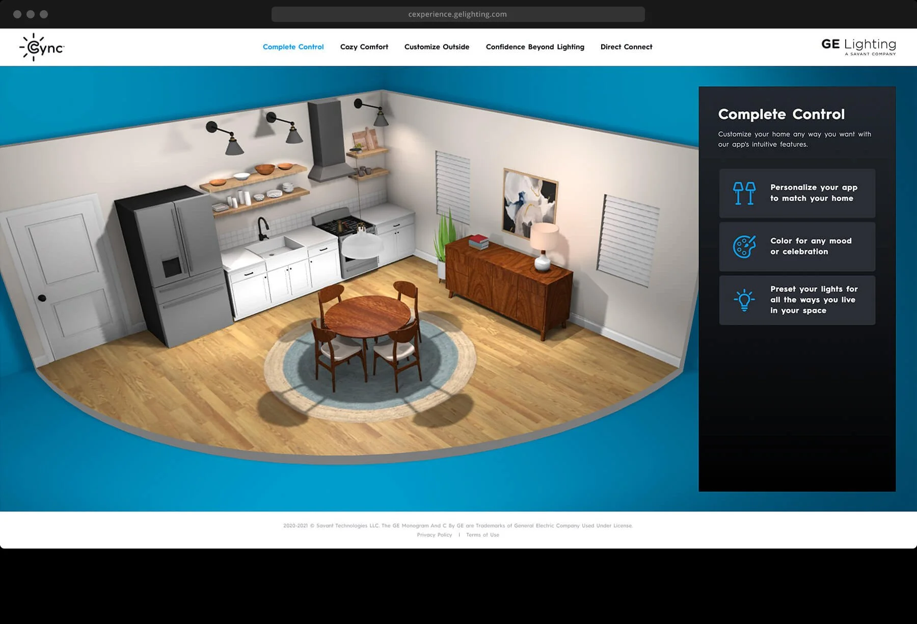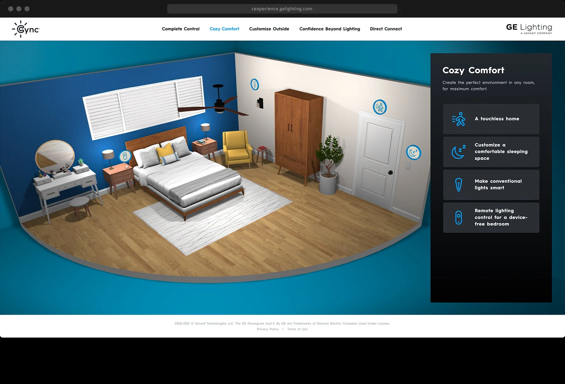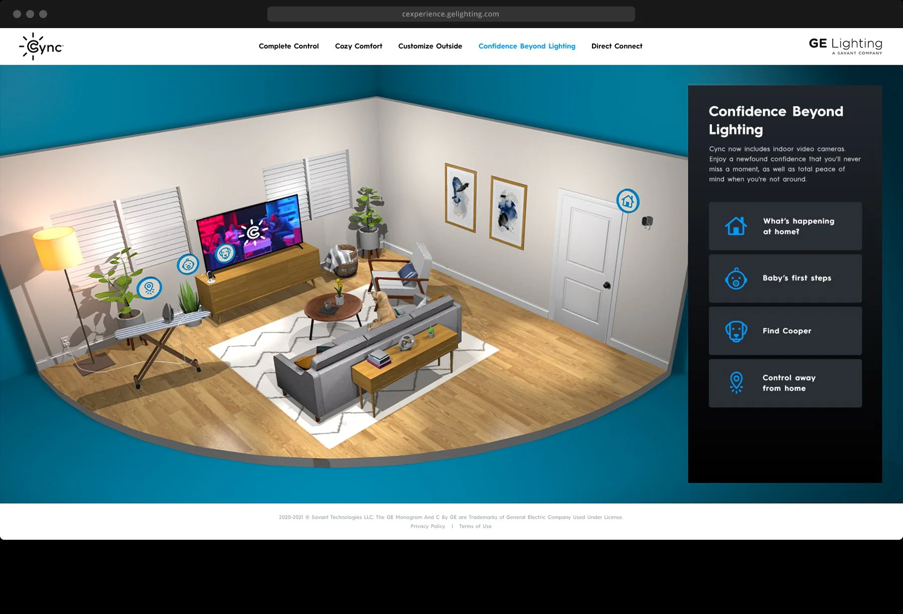 Developed for GE Lighting’s CES 2021 digital booth, the experience allowed the home brand to showcase their Cync line and other new products for B2B commerce. During the conference, the GE Lighting sales team virtually walked attendees through the experience, which featured 4 different home environments with multiple interactive demos that showcased various GE Lighting products, including touchless fixtures, colorful mood lighting and smart appliances.