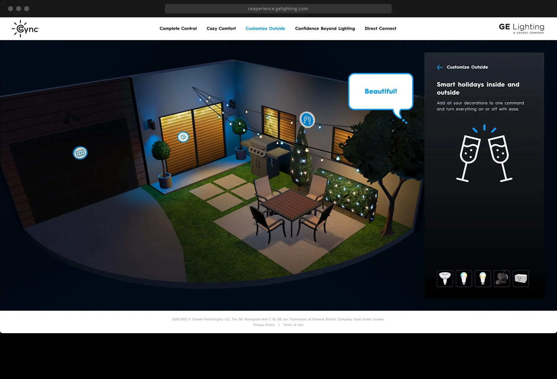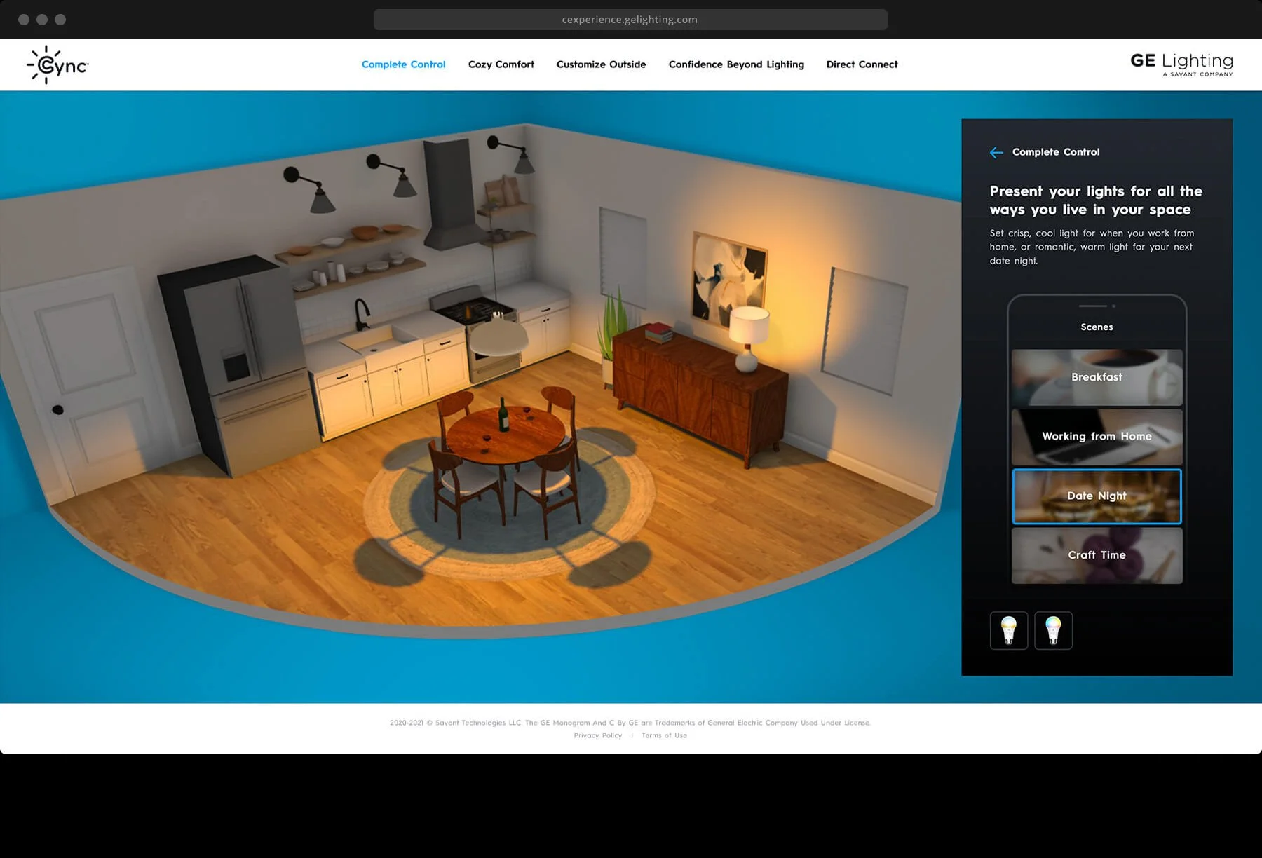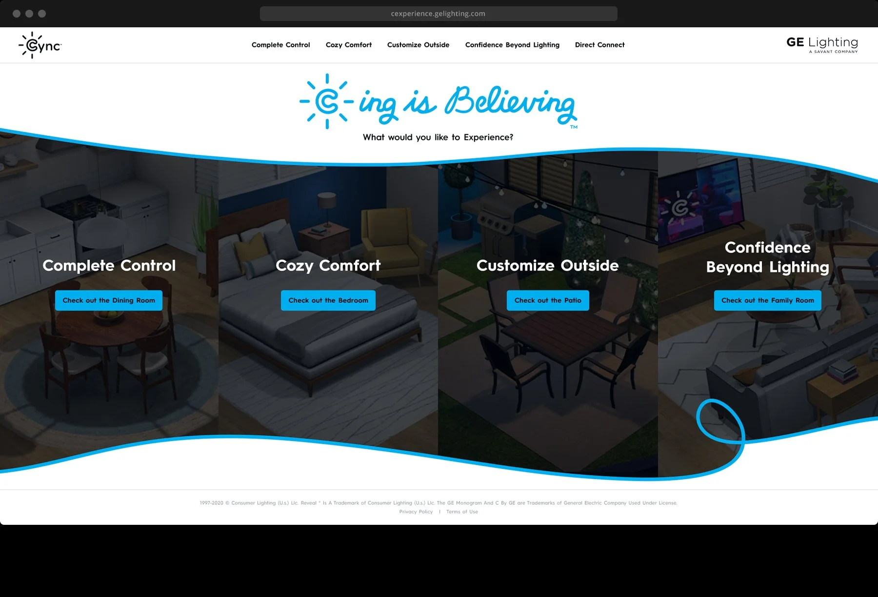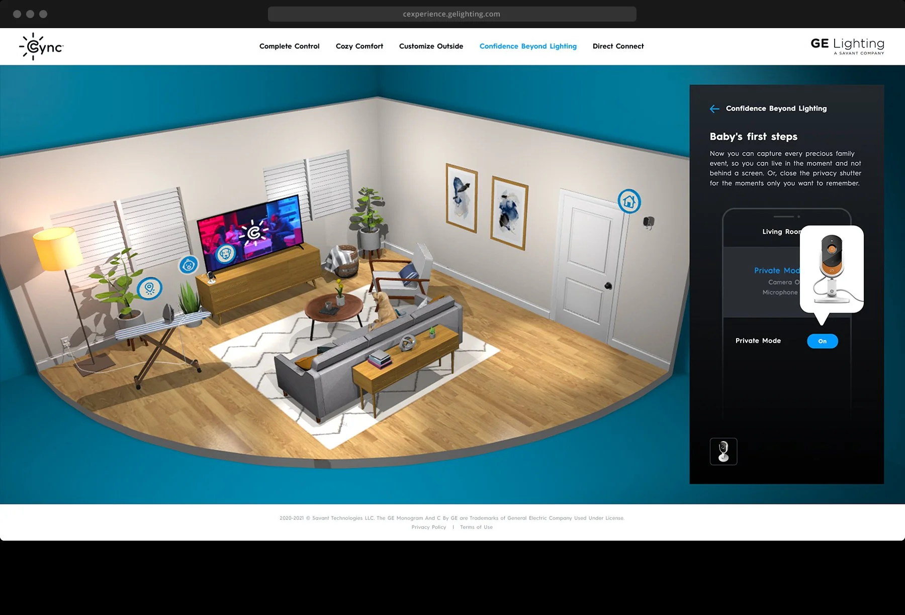 Developed for GE Lighting’s CES 2021 digital booth, the experience allowed the home brand to showcase their Cync line and other new products for B2B commerce. During the conference, the GE Lighting sales team virtually walked attendees through the experience, which featured 4 different home environments with multiple interactive demos that showcased various GE Lighting products, including touchless fixtures, colorful mood lighting and smart appliances.