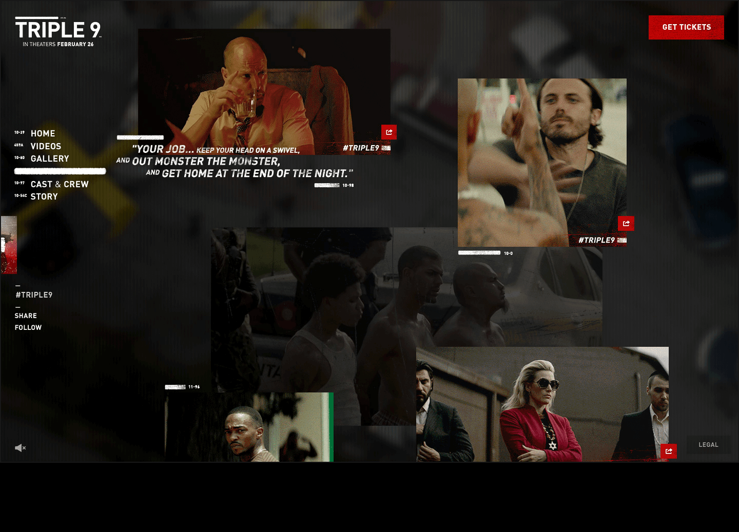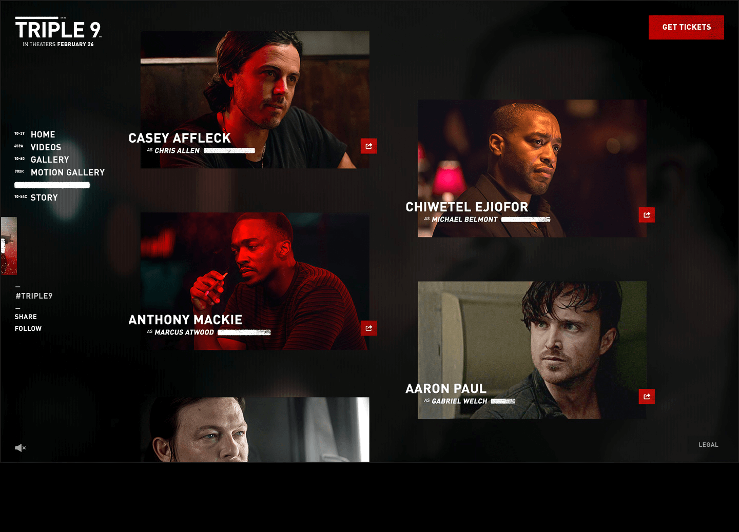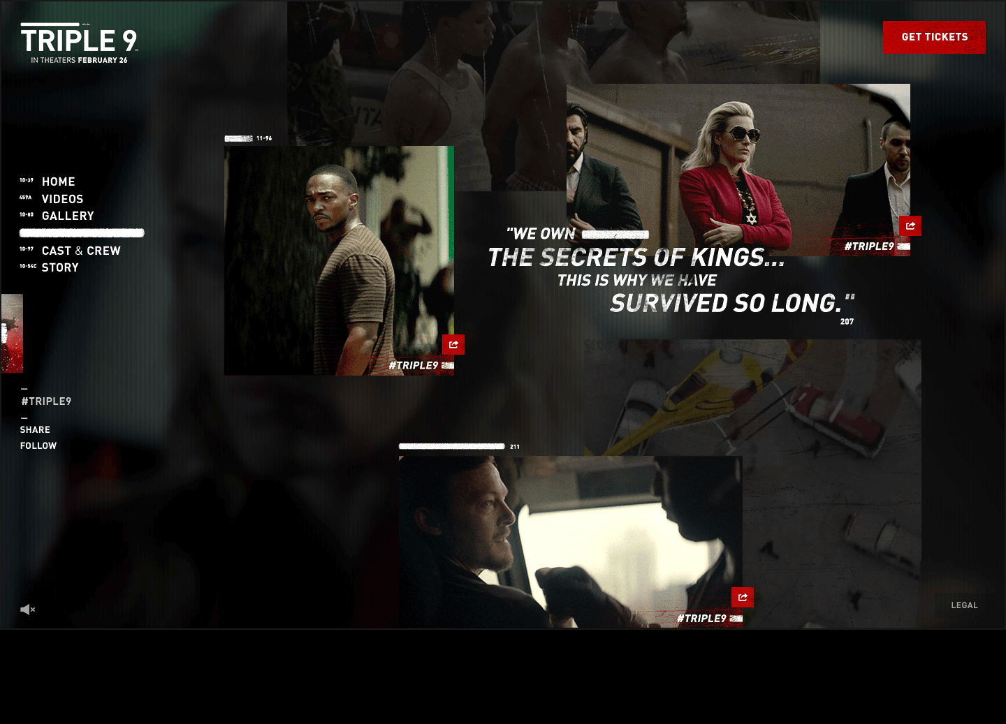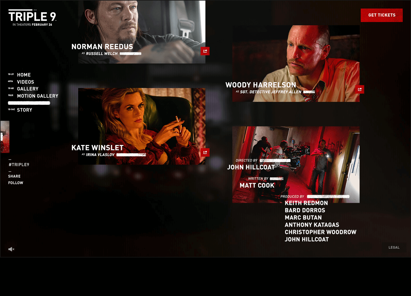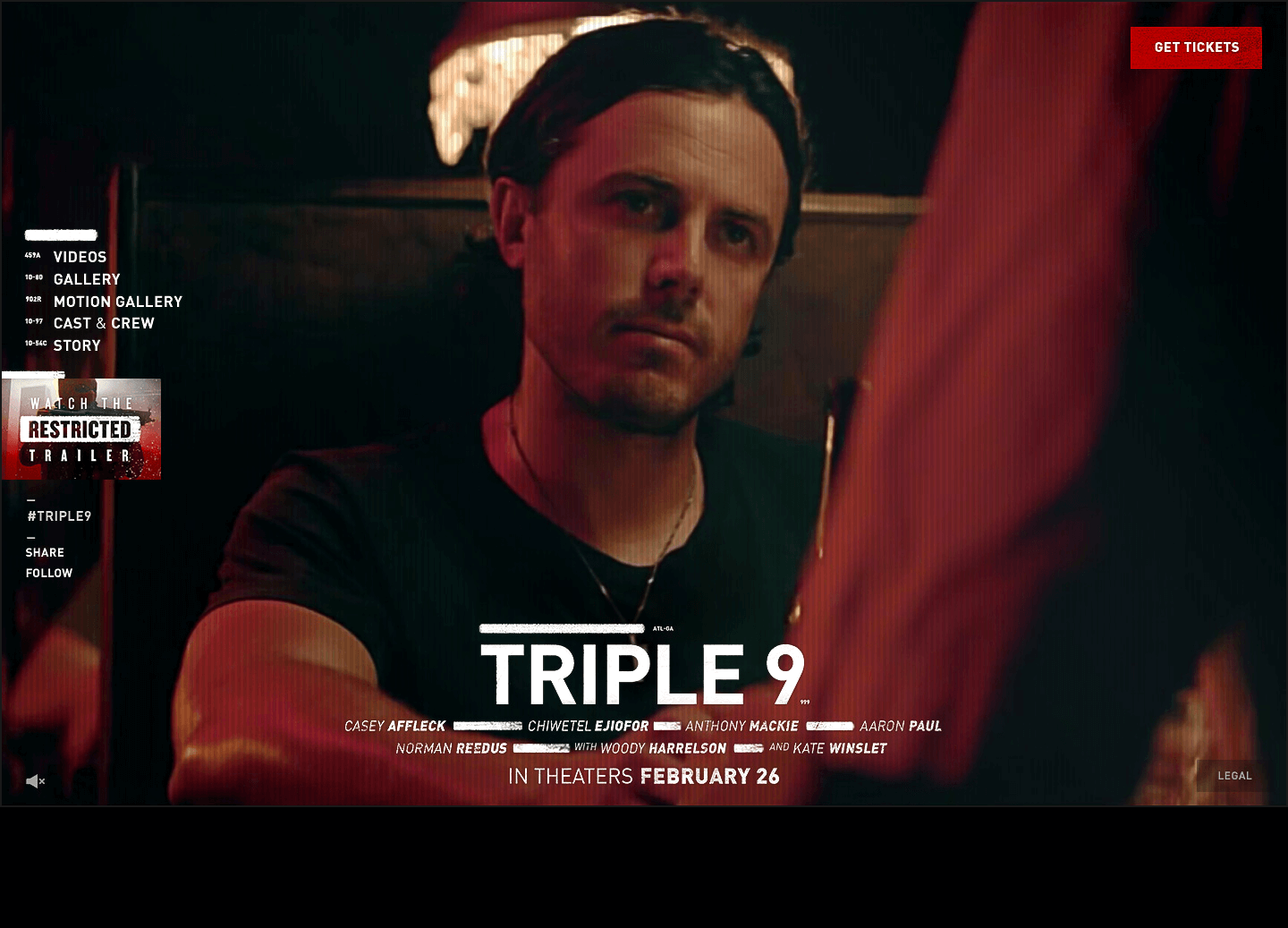 To promote the release of Triple 9, an action-packed heist thriller, Open Road Films needed a website that showcased the film's themes and its ensemble cast, including Casey Affleck, Chiwetel Ejiofor, Anthony Mackie, Aaron Paul, Clifton Collins Jr., Norman Reedus, Teresa Palmer, Michael K. Williams, Gal Gadot, Woody Harrelson, and Kate Winslet. Working closely with Open Road, we developed a bold, dynamic website featuring large video backgrounds, red-band content, and shareable GIFs. The site also allowed users to buy tickets, view videos and pictures, and learn more about the film.