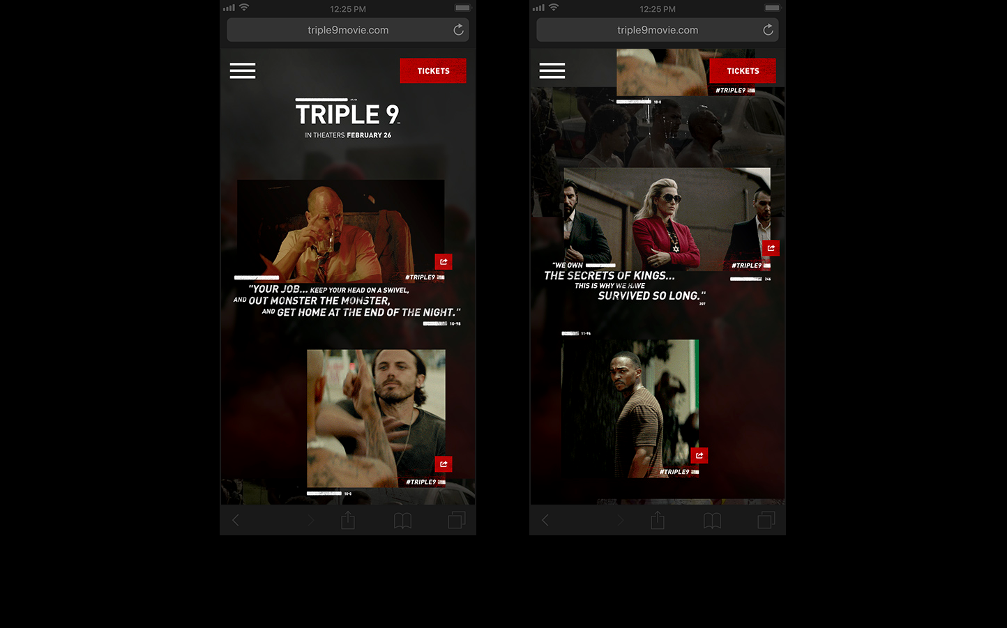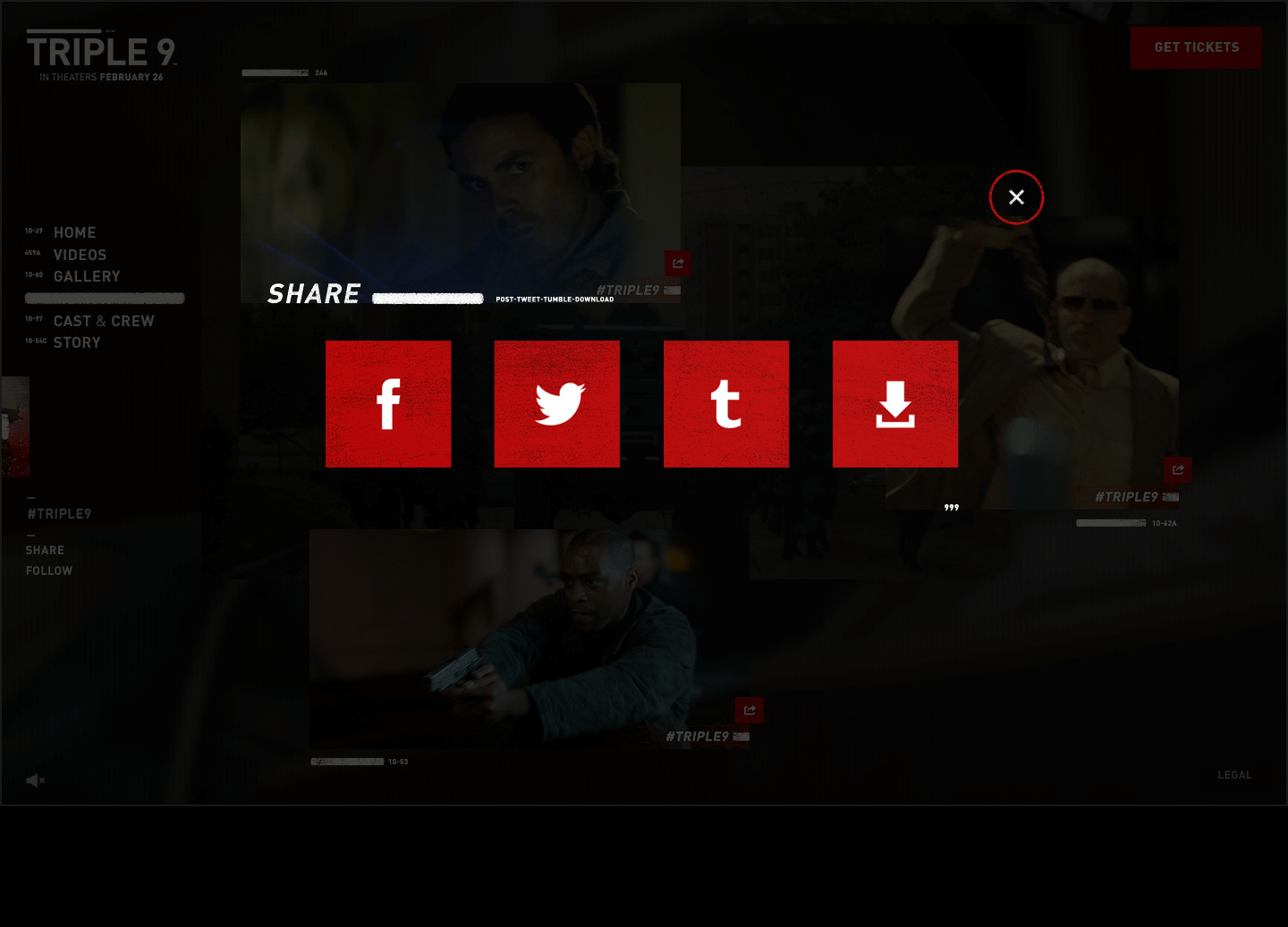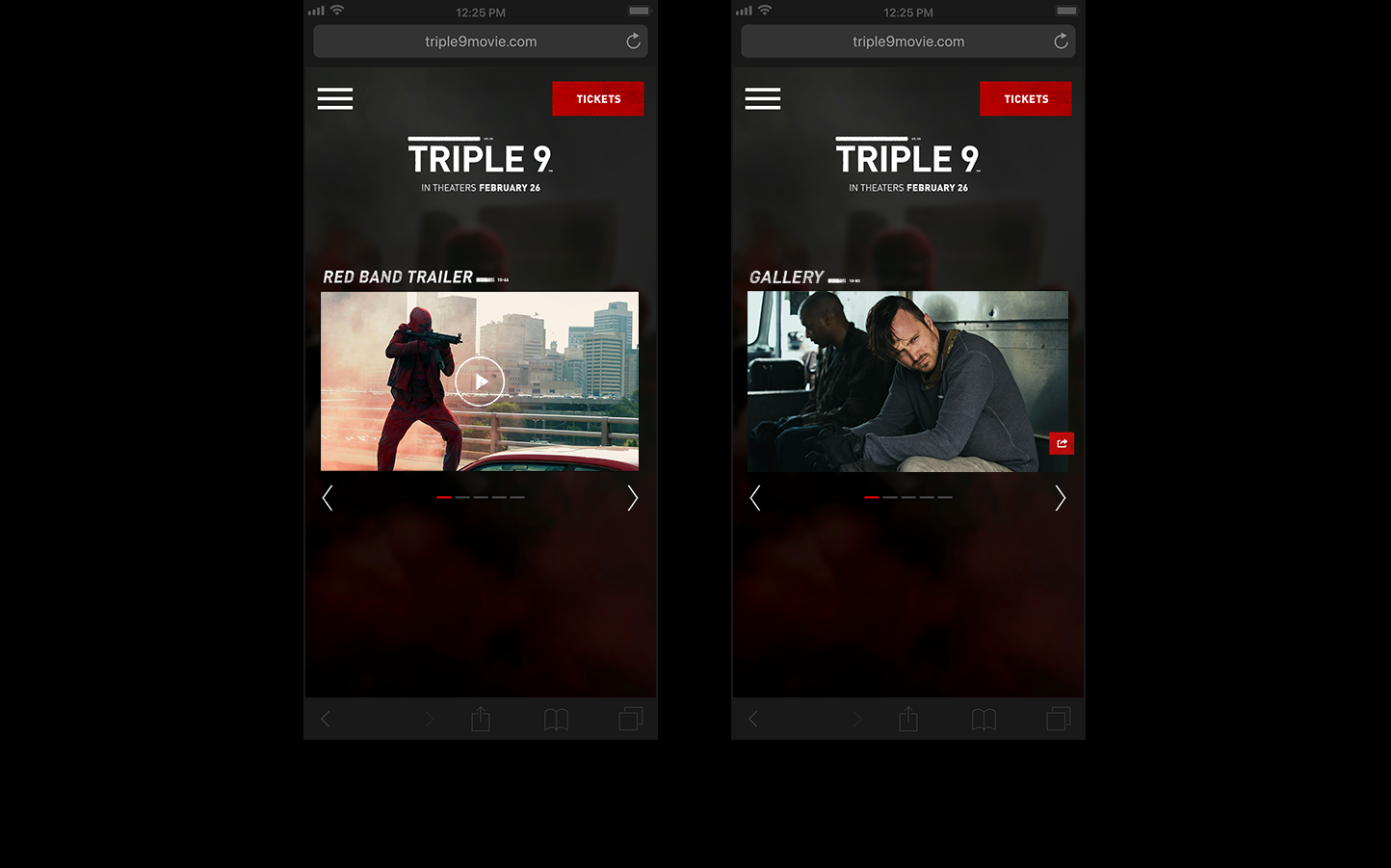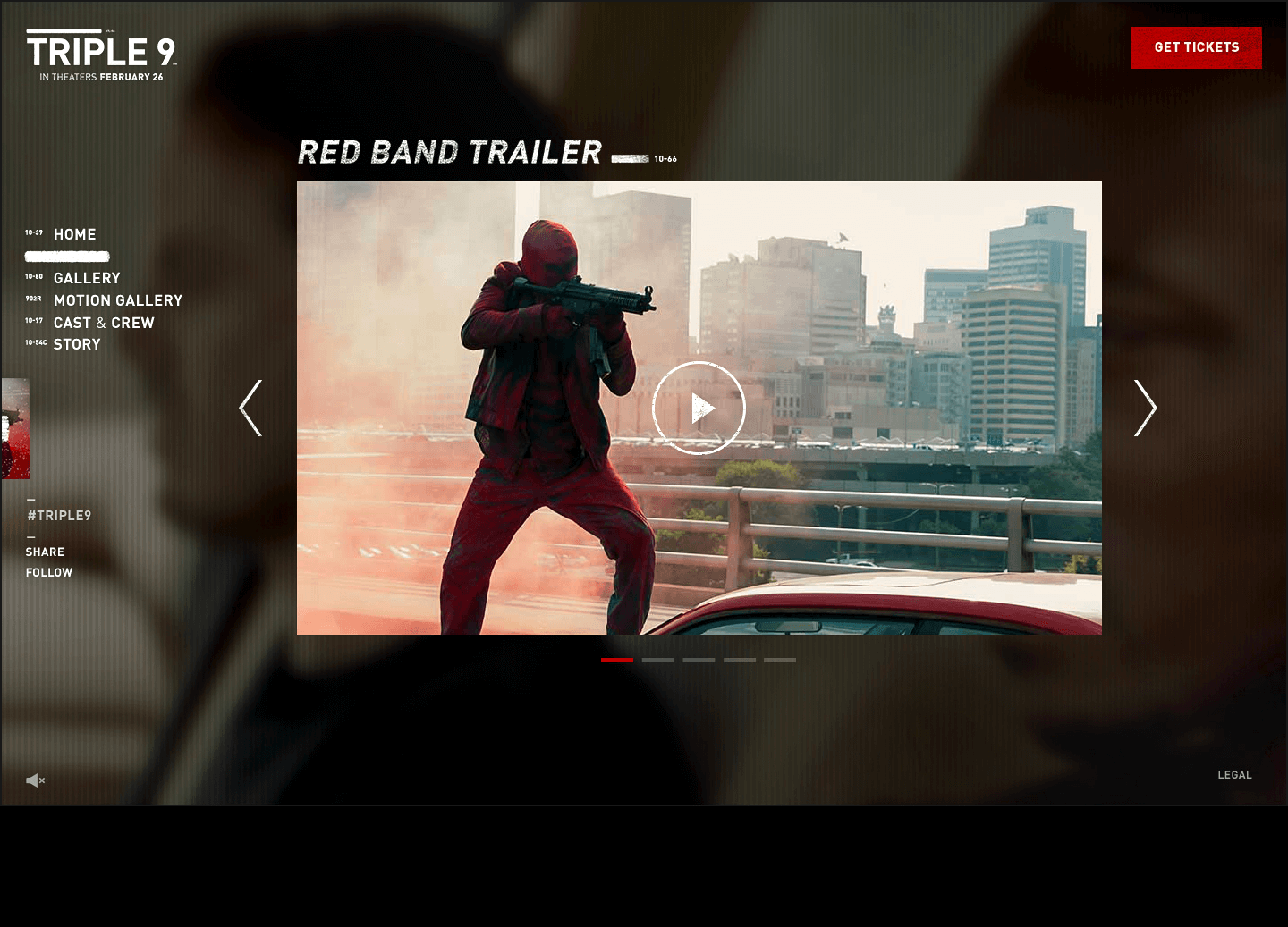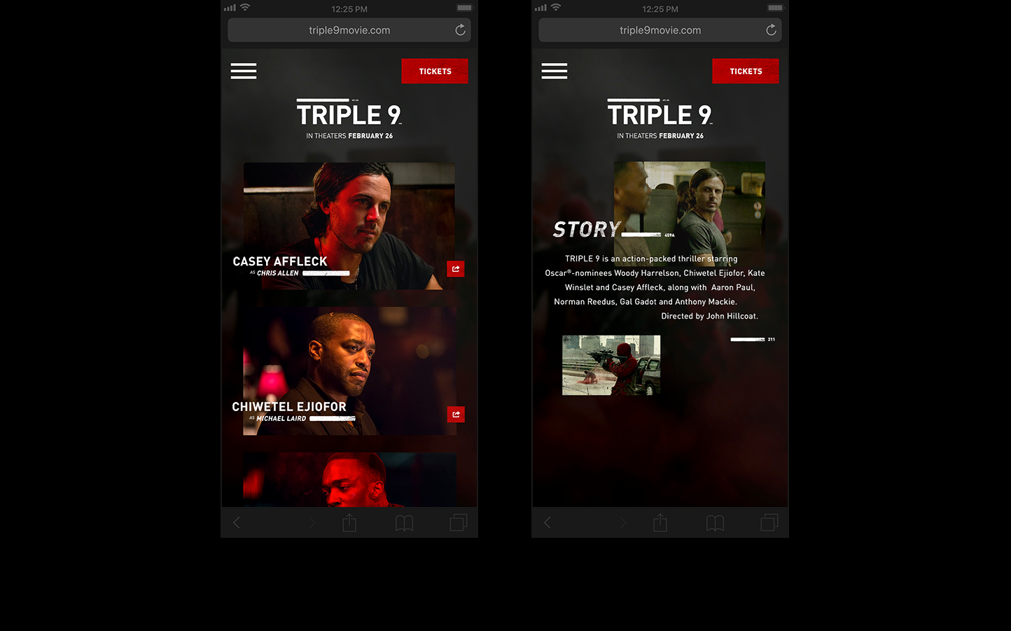 To promote the release of Triple 9, an action-packed heist thriller, Open Road Films needed a website that showcased the film's themes and its ensemble cast, including Casey Affleck, Chiwetel Ejiofor, Anthony Mackie, Aaron Paul, Clifton Collins Jr., Norman Reedus, Teresa Palmer, Michael K. Williams, Gal Gadot, Woody Harrelson, and Kate Winslet. Working closely with Open Road, we developed a bold, dynamic website featuring large video backgrounds, red-band content, and shareable GIFs. The site also allowed users to buy tickets, view videos and pictures, and learn more about the film.